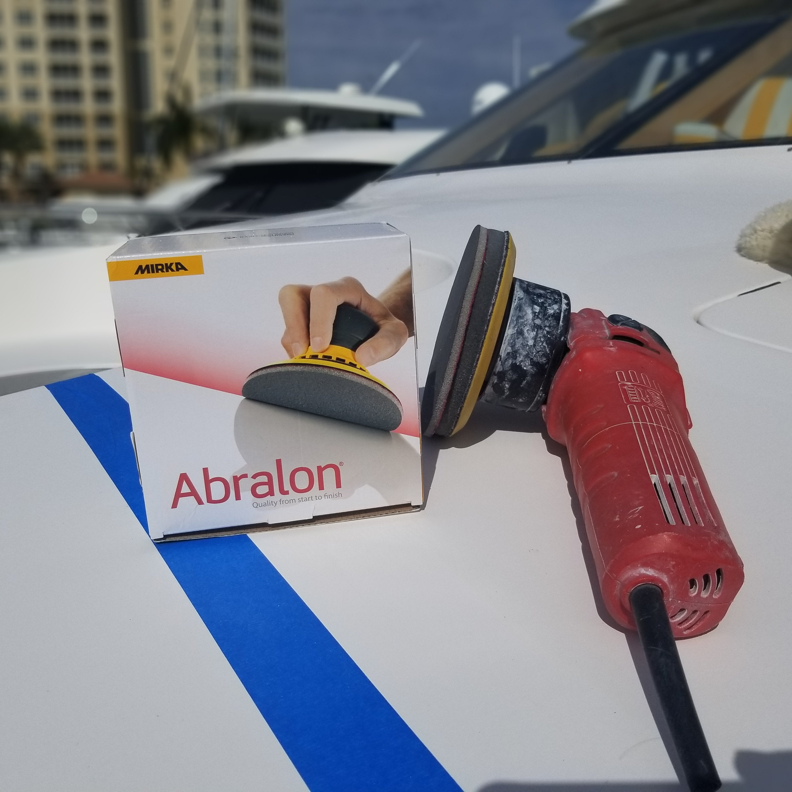 Abralon is a unique, multi-functional sanding material developed for tackling both smooth and profiled surfaces. It is AWESOME on gel coat and works very well on heavily oxidized boats that need a scuff sand. Its patented, flexible construction allows it to create a smooth sanding pattern on angled surfaces and edges while minimizing the risk of pressure marks (PIGTAILS). The flexible weave also allows water and air to pass freely, making it suitable for both dry and wet sanding, by machine or by hand - THEY DONT GUM UP!\